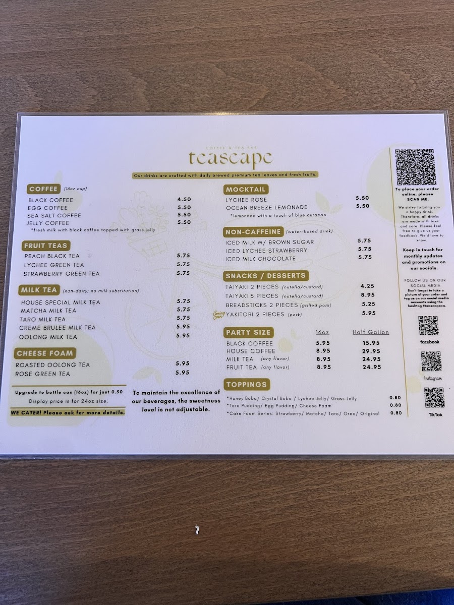 Guests rave about the relaxing ambiance and the helping staff, making it a perfect spot for studying or enjoying delightful taiyaki with your drink. Whether it's a solo retreat or a gathering with friends, Teascape is sure to leave a lasting impression!